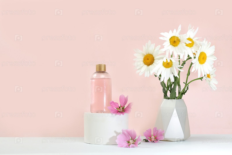Спа и оздоровительная композиция с ароматной розовой водой и цветами орхидеи и ромашки, ароматерапия и уход за кожей, концепция образа жизни, приглашение и реклама салона, избирательный фокус