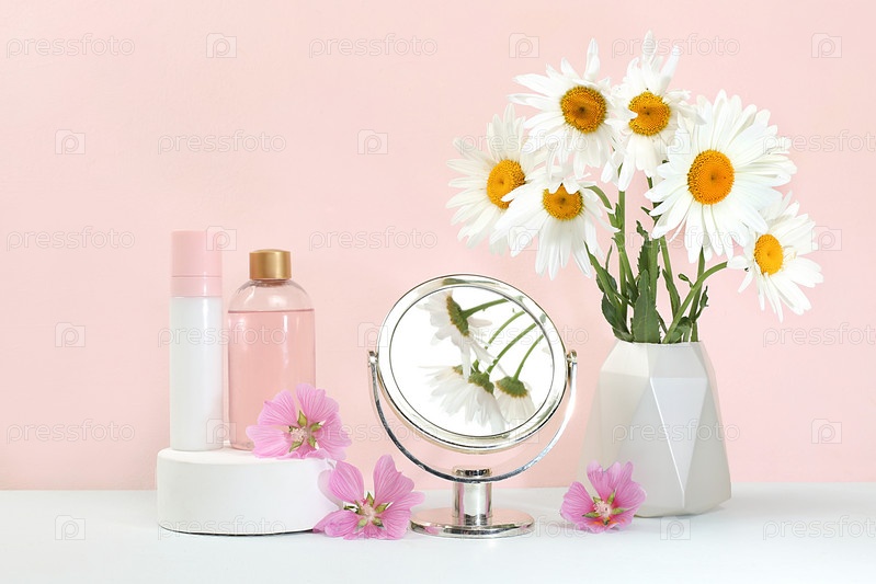 Спа и оздоровительная композиция с ароматной розовой водой и цветами орхидеи и ромашки, ароматерапия и уход за кожей, концепция образа жизни, приглашение и реклама салона, избирательный фокус