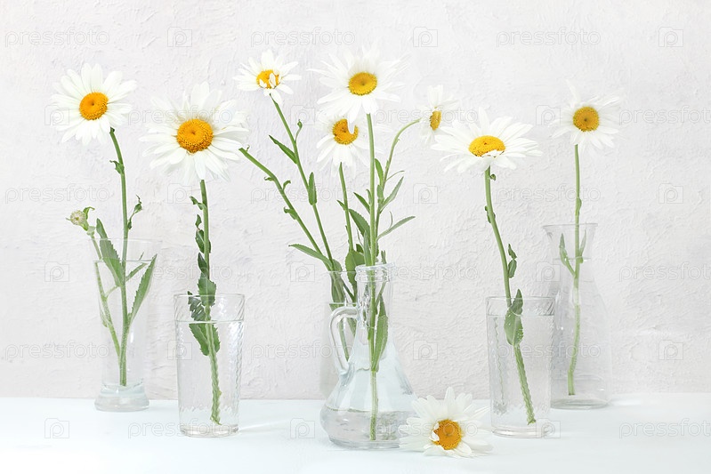 Красивые ромашковые цветы в вазе на светлом фоне с местом для текста, летний баннер для рекламы, минимальная концепция праздника с цветами, поздравительная открытка на свадьбу, день рождения, день матери, выборочный фокус