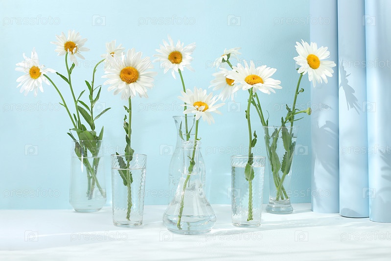 Красивая цветочная композиция с белыми ромашками в вазе, пустой подиум для продуктов, премиальная сцена для демонстрации продукта и бизнес-концепция. Минимальная современная эстетика. элегантная концепция красоты, избирательный фокус