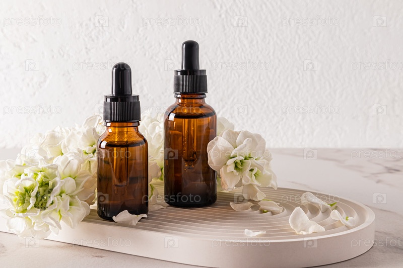 Две косметические бутылки с косметическим продуктом для личной гигиены лежат на белом гипсовом подносе в виде арки и цветов. передний план
