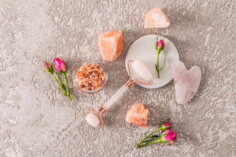 Вид сверху на кварцевый валик и гуа ша на белой круглой мраморной подставке, бутоны роз и комочки соли. Концепция спа, релаксация. цементный фон