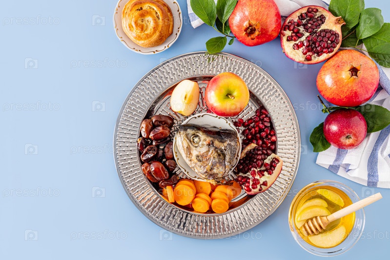 Блюдо с новогодним угощением к новогоднему празднику Рош ха-Шана. гранат, мед, финики, кусочки яблока и морковь. Синий фон