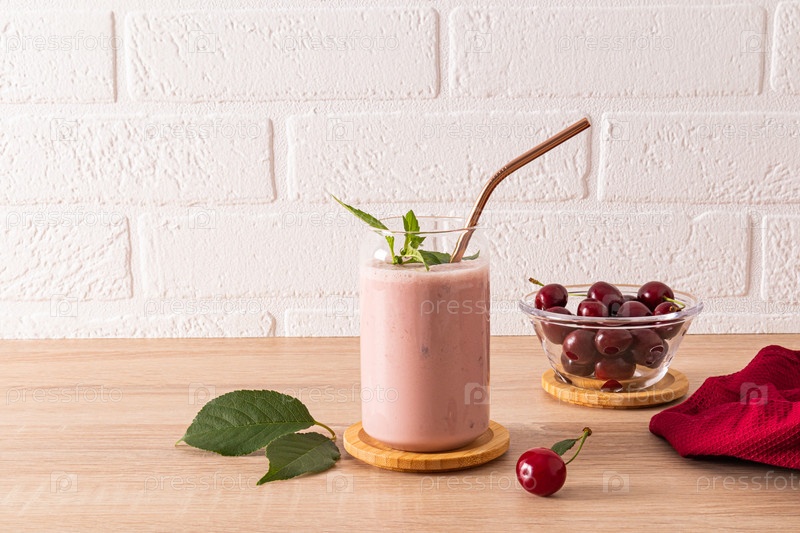 Свежеприготовленный домашний смузи из спелой вишни в стеклянном стакане с металлической соломой на фоне стены из белого кирпича. Здоровое питание
