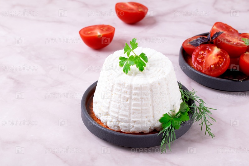Свежий сыр рикотта с петрушкой подается с помидорами черри на белом столе. итальянская кухня