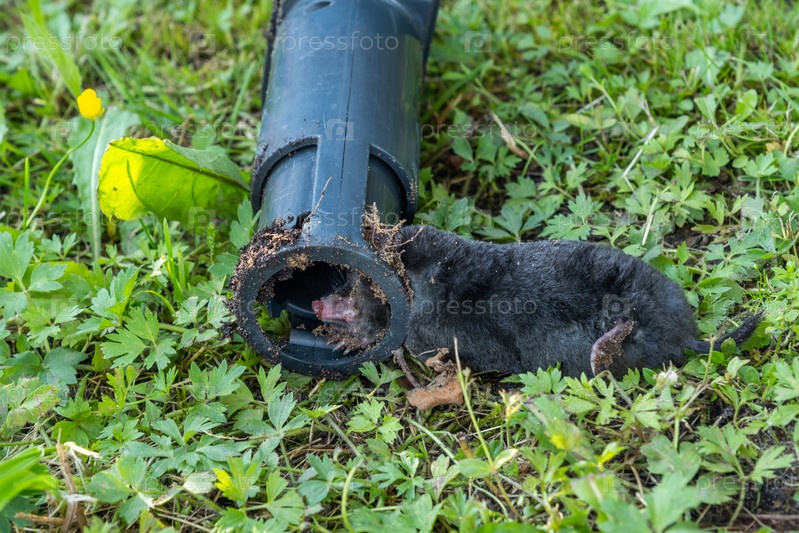 Большой крот в ловушке лежит на лужайке, крупным планом