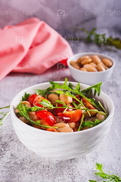 Аппетитный салат из консервированной белой фасоли, помидоров черри и рукколы в вертикальном виде миски