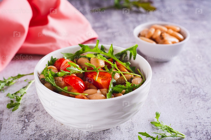 Аппетитный салат из консервированной белой фасоли, помидоров черри и рукколы в миске