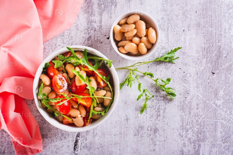 Аппетитный салат из консервированной белой фасоли, помидоров черри и рукколы в миске сверху