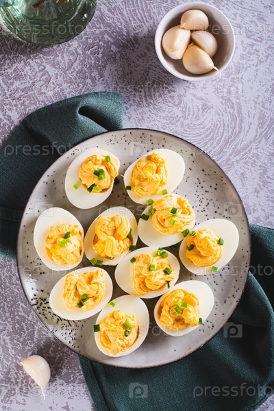 Вареные яйца, фаршированные желтком, сыром, чесноком и майонезом на тарелке и вертикальном виде