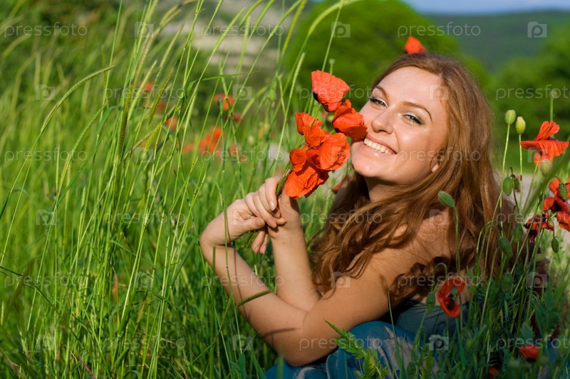 Красивая девушка с букетом маков на лугу