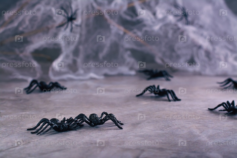 Хэллоуин фон черные пауки и паутина на сером