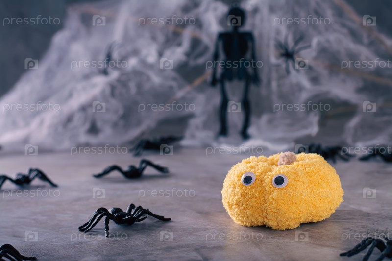 Хэллоуин вязаная тыква с глазами и пауками на фоне паутины