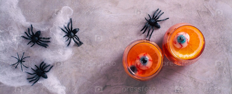 Хэллоуин фруктовый кровавый коктейль с глазами и апельсином в очках вид сверху веб-баннер