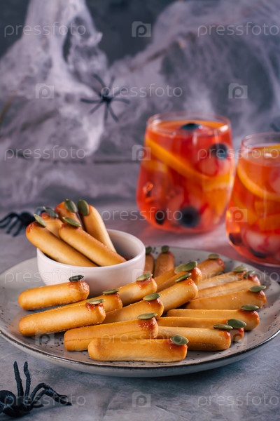 Хэллоуин угощение солеными хлебными палочками с ногтями из тыквенных семечек с кетчупом на тарелке, вид сверху