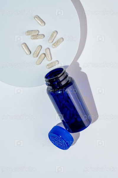 Открытая бутылка пищевой добавки с прозрачными капсулами на белом подиуме. Здоровый образ жизни, витамины и минералы