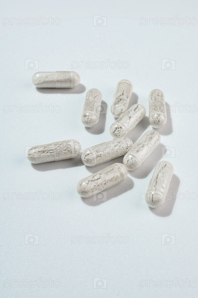 Органические пищевые добавки, различные минералы и витамины, разбросанные на белом фоне