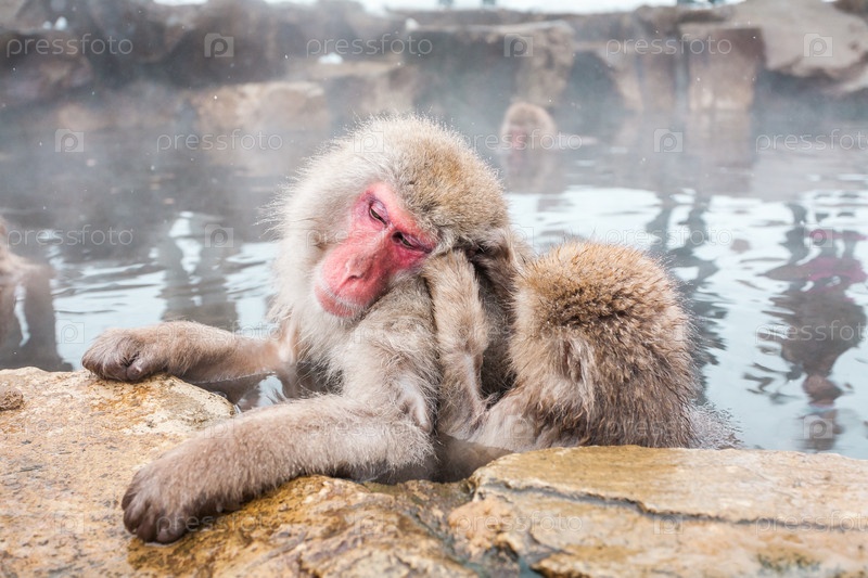 Группа снежных обезьян, спящих в горячем источнике, Япония