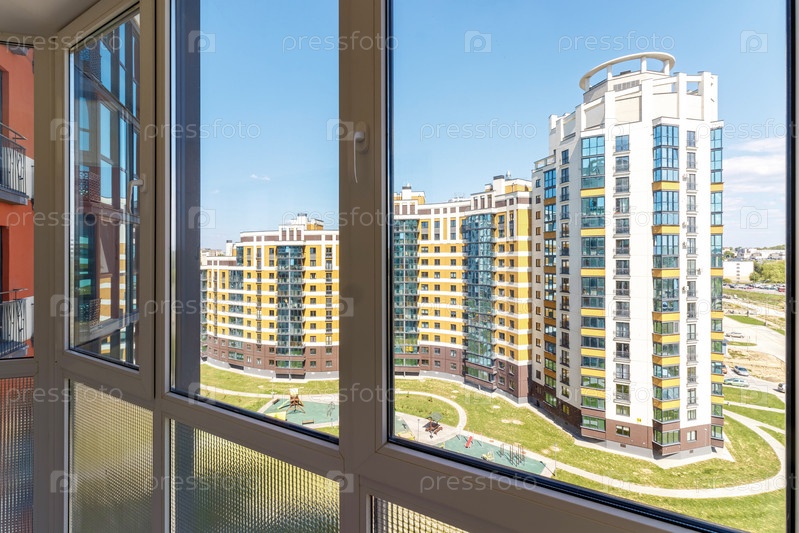 Вид через огромное окно балкона на парковую зону и другие дома