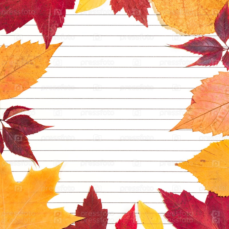 Крупным планом чистый лист бумаги в линейку, окруженный осенними листьями. Вид сверху, пространство для текста