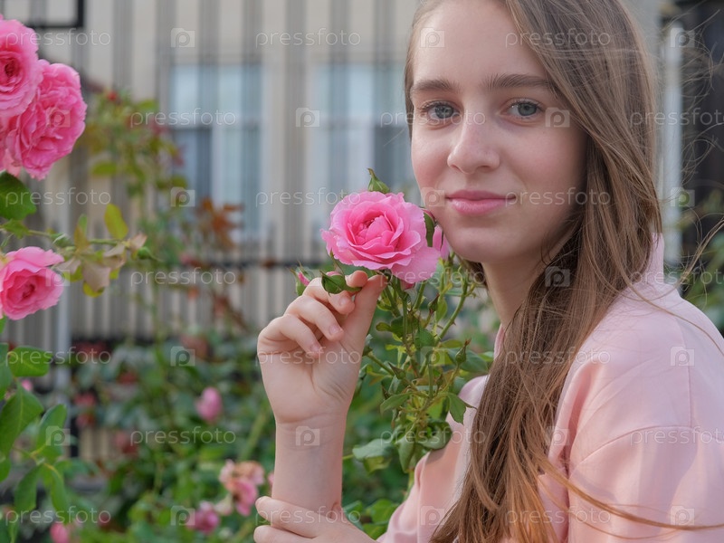 Юная девушка с длинными волосами в розовой блузке с розовой розой в руках