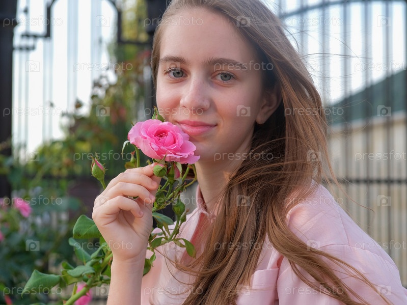 Юная девушка с легкой улыбкой и длинными, распущенными волосами с розовой розой в руках