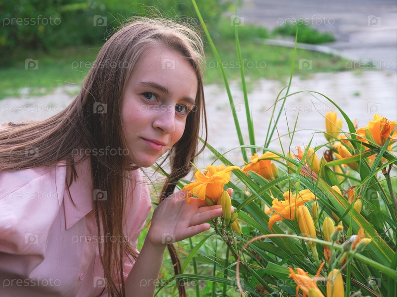 Девочка с длинными волосами наклонилась к желтым цветам на клумбе