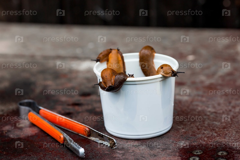 Большой план испанской слизистой улитки Arion lusitanicus в ведрах. В саду ползут большие слизистые коричневые улитки. Инвазия повреждает листья и посевы. Коллекция инвазивных видов