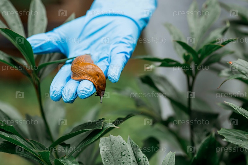 Большой план испанской слизистой улитки Arion lusitanicus в руке садовника. По саду ползут большие слизистые коричневые улитки. Инвазия повреждает листья и посевы. Коллекция инвазивных видов