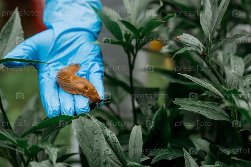 Большой план испанской слизистой улитки Arion lusitanicus в руке садовника. По саду ползут большие слизистые коричневые улитки. Инвазия повреждает листья и посевы. Коллекция инвазивных видов