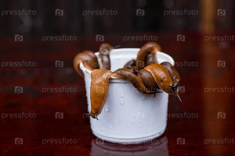 Большой план испанской слизистой улитки Arion lusitanicus в ведрах. В саду ползут большие слизистые коричневые улитки. Инвазия повреждает листья и посевы. Коллекция инвазивных видов
