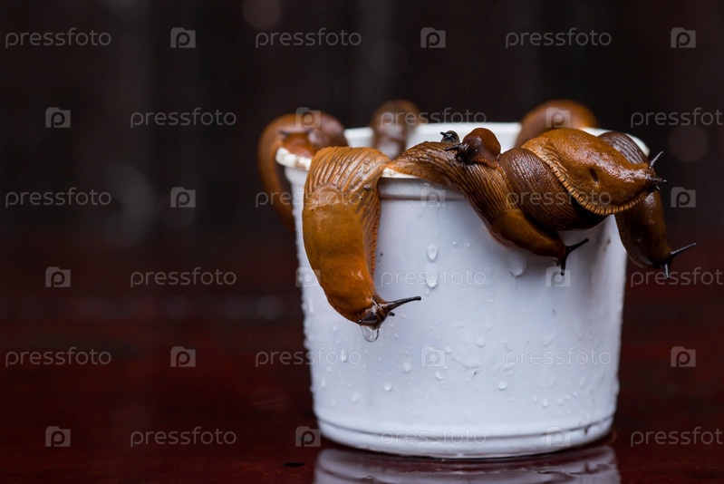 Большой план испанской слизистой улитки Arion lusitanicus в ведрах. В саду ползут большие слизистые коричневые улитки. Инвазия повреждает листья и посевы. Коллекция инвазивных видов