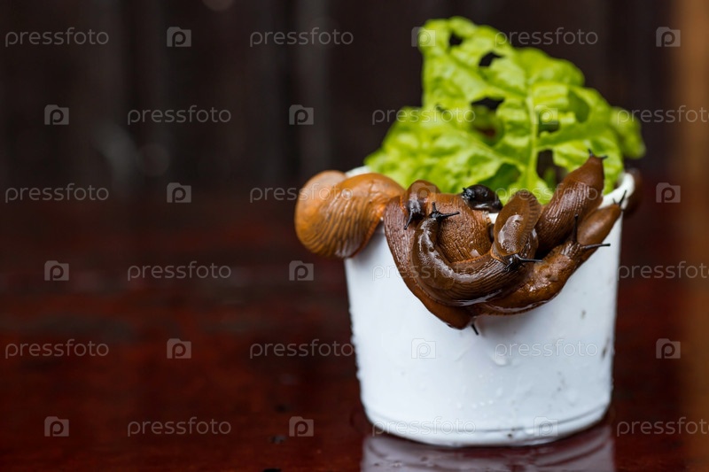 Большой план испанской слизистой улитки Arion lusitanicus в ведрах. В саду ползут большие слизистые коричневые улитки. Инвазия повреждает листья и посевы. Коллекция инвазивных видов