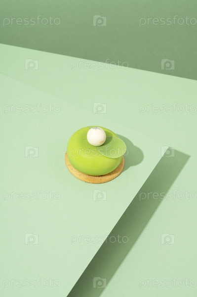 Свежеиспеченное пирожное с зеленой и белой глазурью на зеленой поверхности
