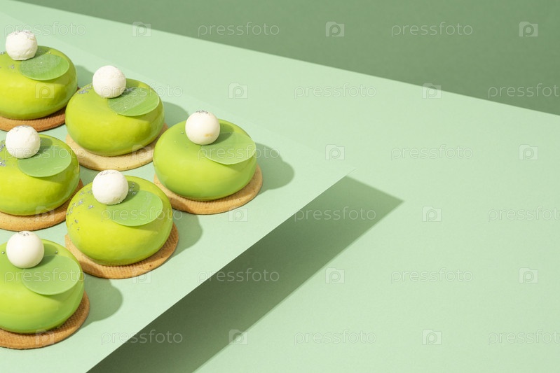 Блюдо с различными угощениями из зеленых пончиков стоит на деревянном столе