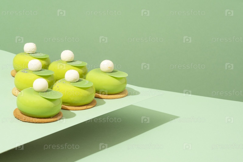 Блюдо с различными угощениями из зеленых пончиков стоит на деревянном столе