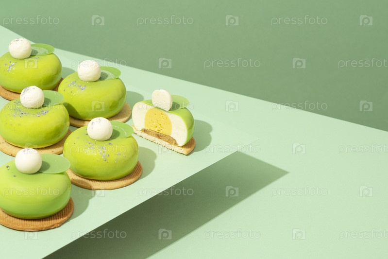 Блюдо с различными угощениями из зеленых пончиков стоит на деревянном столе