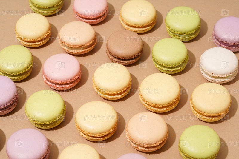Вид сверху на бежевую поверхность стола с множеством разноцветных макарон, выстроенных аккуратными рядами