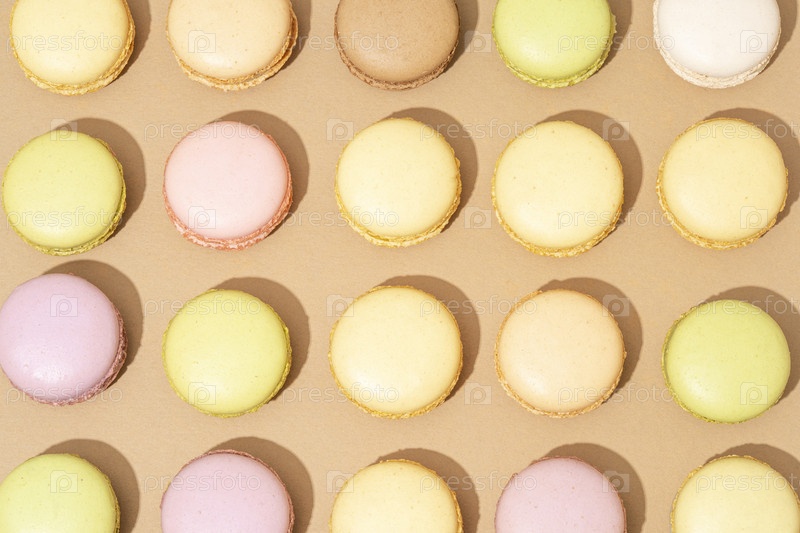 Ассорти макарон аккуратно разложены рядами на плоской поверхности