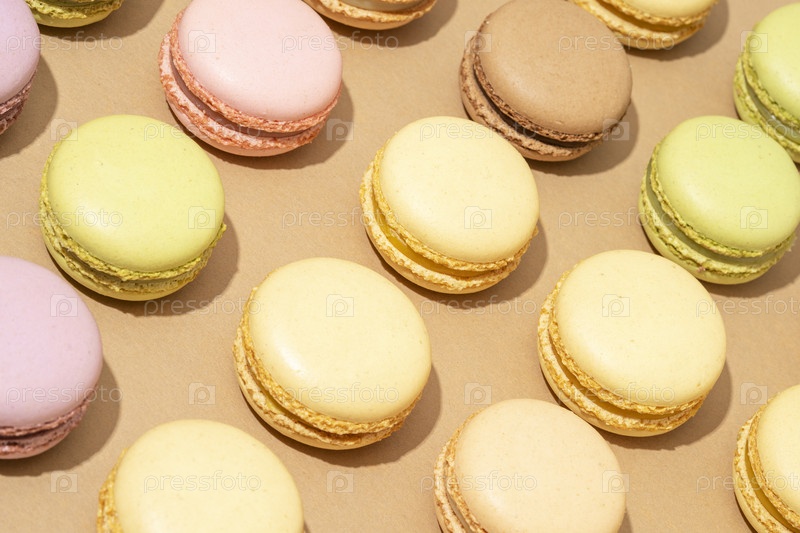Вид сверху на бежевую поверхность стола с множеством разноцветных макарон, выстроенных аккуратными рядами