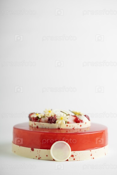 Аппетитный торт на красной и белой полосатой подставке для торта, готовый к употреблению
