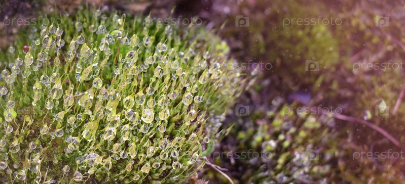 Макросъемка крупных дождевых капель, покрывающих мох. Крупный план, выборочный фокус