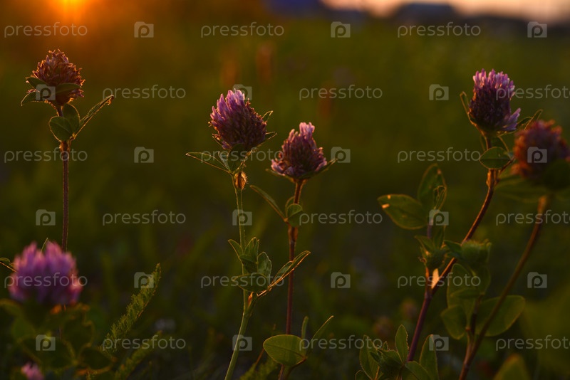 Цветы клевера лугового в солнечном свете. Луговой клевер в лучах заходящего солнца