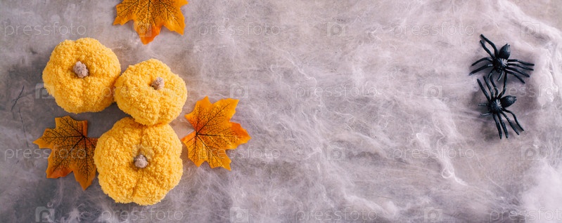 Пауки, тыквы и осенние листья на паутине для хэллоуина вид сверху веб-баннер
