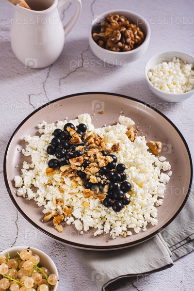 Домашний творог со свежей черной смородиной и грецкими орехами на тарелке по вертикали