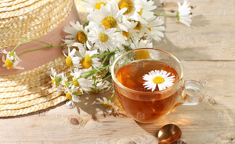 Ромашковый чай в прозрачной чашке с натуральными маленькими цветками ромашки и летняя шляпа на светлом деревенском столе, концепция травяного чая и правильное натуральное питание, избирательный фокус