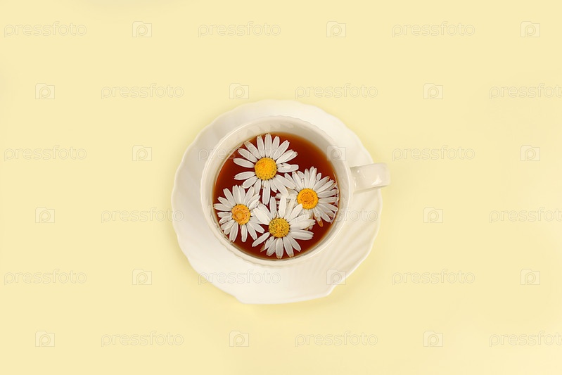 Ромашковый чай в чашке с натуральными маленькими цветками ромашки на светлом столе, концепция травяного чая и правильного естественного питания, летняя открытка,