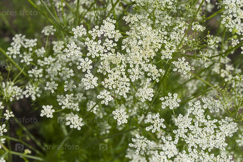 Цветение обыкновенного тмина (лат.Carum carvi) на грядке в Аптекарском саду (филиал ботанического сада МГУ).Москва