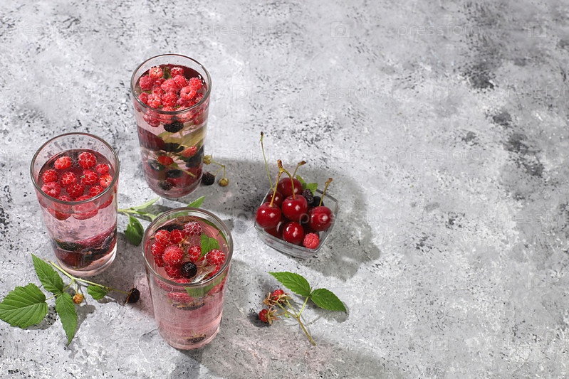 Детокс фруктовая ароматизированная вода с малиной на сером фоне. Фруктовый сок и ингредиенты, концепция похудения, здоровая и натуральная пища, освежающий летний коктейль с лимонадом. выборочный фокус