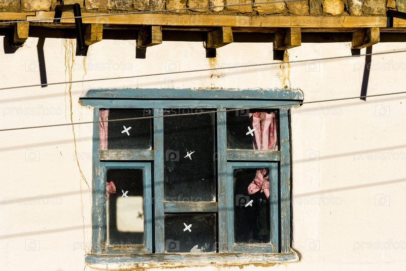 Старое традиционное деревянное окно в небольшой местной деревне в Непале, Гималаи